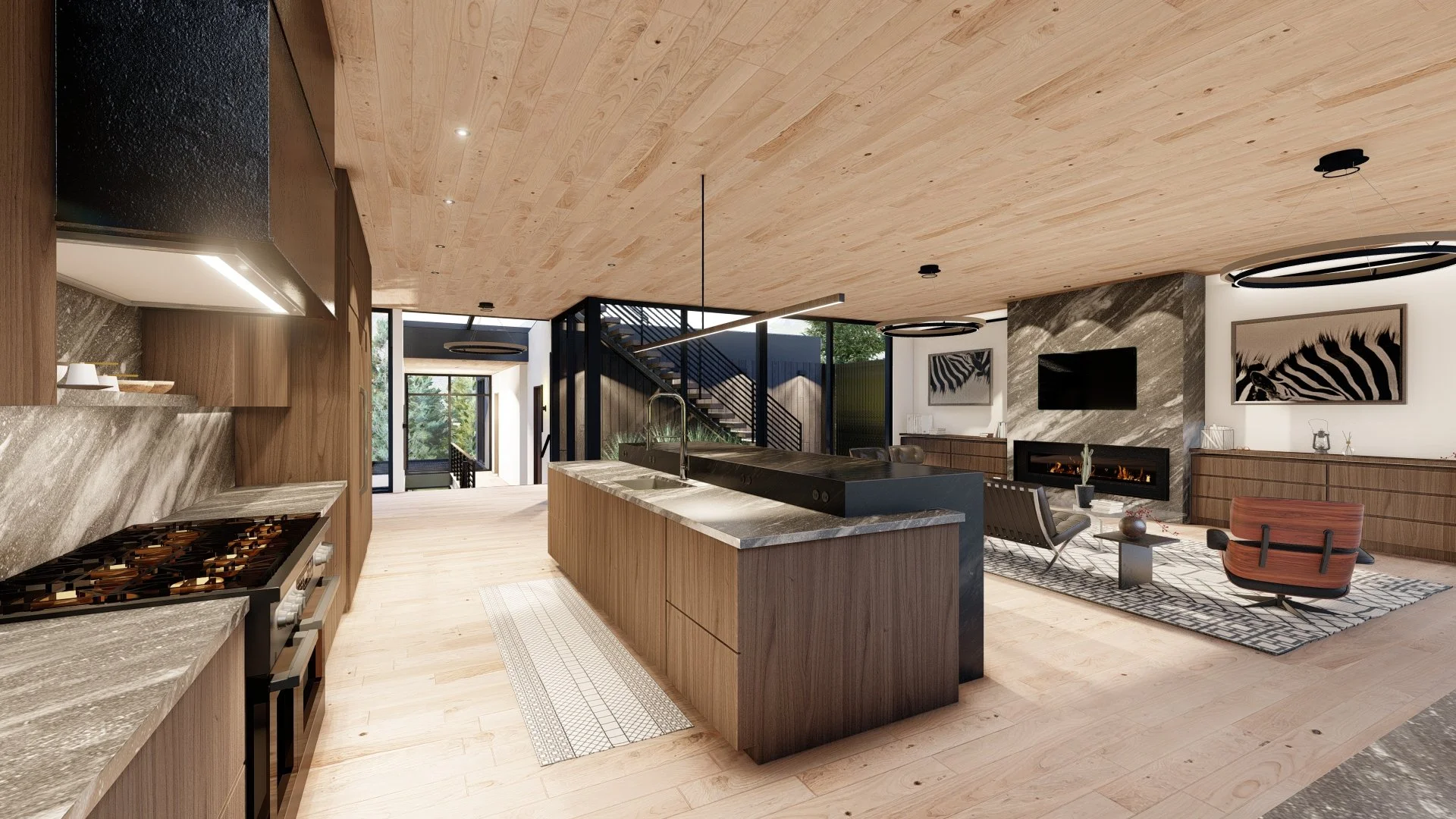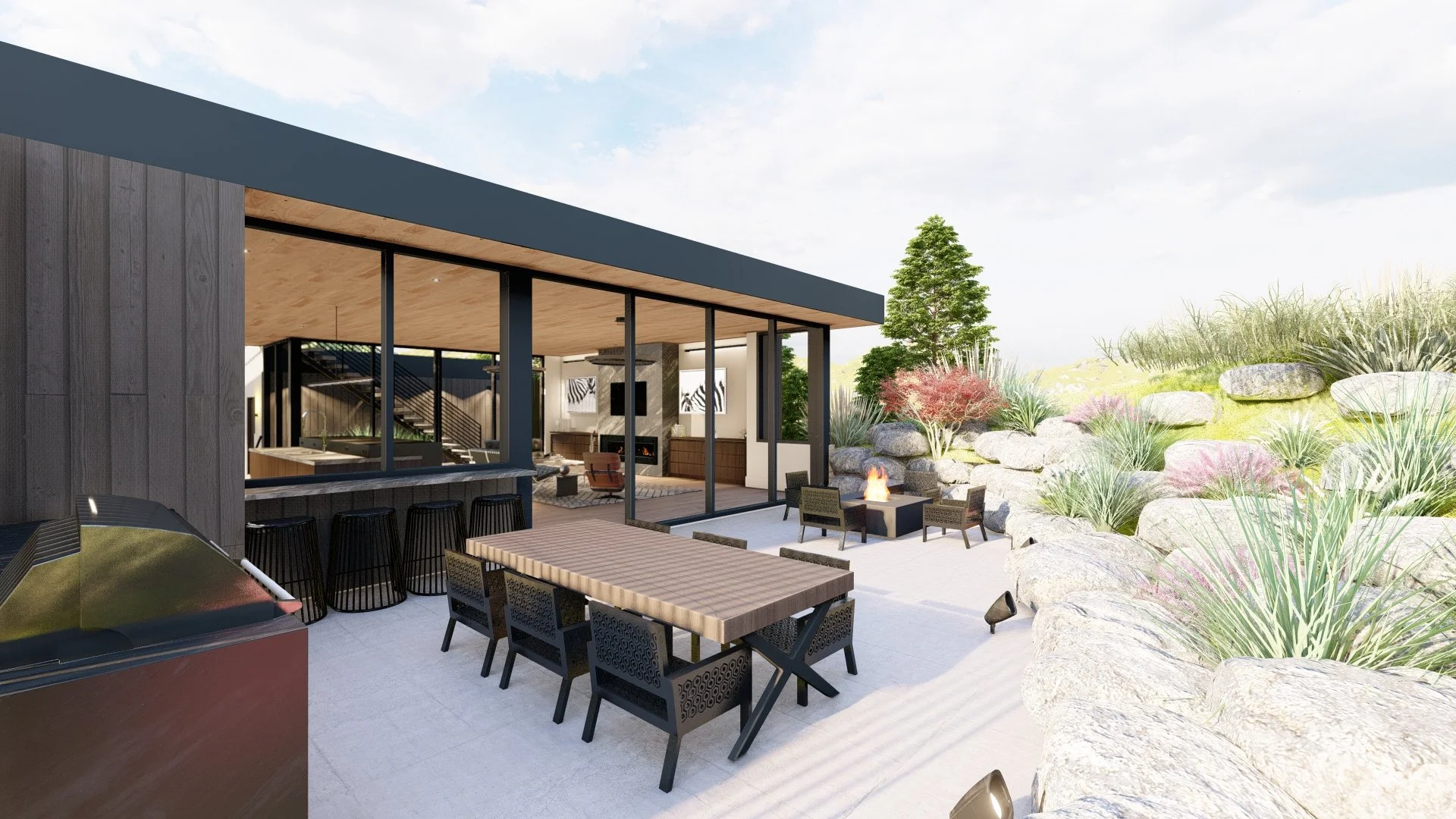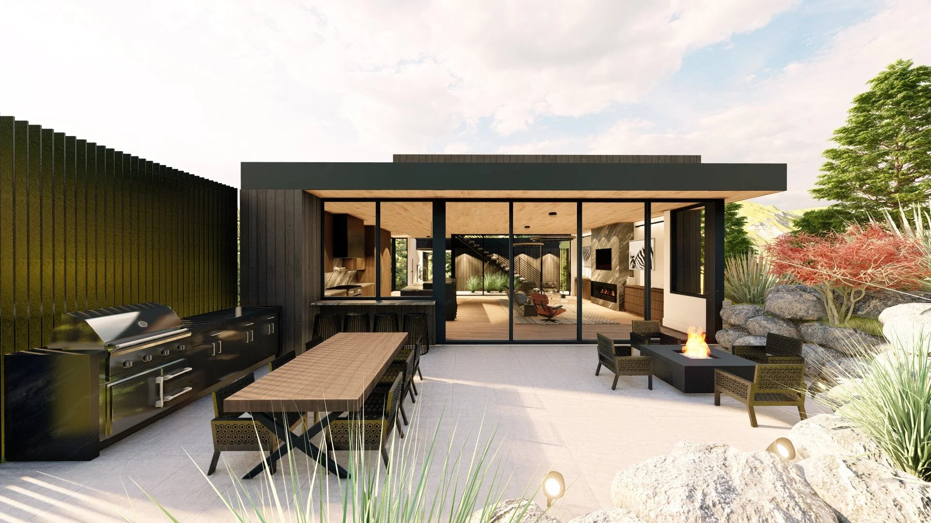 Unrivaled new construction home nestled in the serene South Boulder foothills sits perched upon a lofty, southern facing lot just feet from expansive open space trails at the base of the iconic Flatirons. A sophisticated dark exterior and a glass encased entryway lead to a thoughtfully designed, open concept home that artfully blends modern luxury with an open-air, outdoor lifestyle. A floating staircase and soaring 10' wood planked ceilings give way to a dreamy chef's kitchen boasting a premium appliance package, custom oak cabinets, stone counters and a sleek, tiered waterfall island bar. An airy great room centered by a stone wrapped fireplace, overlooks floor to ceiling glass doors that seamlessly open to an outdoor patio boasting a fire pit, built-in grill, and a bar with an accordion window into the kitchen; perfect for entertaining and alfresco dining. A clever, private atrium floods the home in natural light and leads to a stunning rooftop deck overlooking exemplary Flatiron views. The primary bedroom suite showcases sweeping easterly views and a private wraparound deck; ideal for enjoying quiet mornings watching the sunrise. A walk-in closet with a secondary washer/dryer leads to an exquisite 5-piece bath offering respite with a luxurious soaking tub and a generously sized shower. A nearby powder room & secondary bedroom with an ensuite bath and walk-in closet complete the main level. Downstairs, a rec room with 9' ceilings, boasts a chic glass wine display, a wet bar, powder room, and a white limestone fireplace that leads to another private patio area. A second primary suite offers a generous closet and a lavish, spa-like ensuite bath featuring a walk-in steam shower. Two additional bedrooms both offer walk-in closets and ensuite baths, creating private enclaves for all guests and family members. A large mudroom off the two-car garage presents the ideal staging ground and completes a masterful floor plan, elegantly designed for function, entertainment and optimal outdoor living.